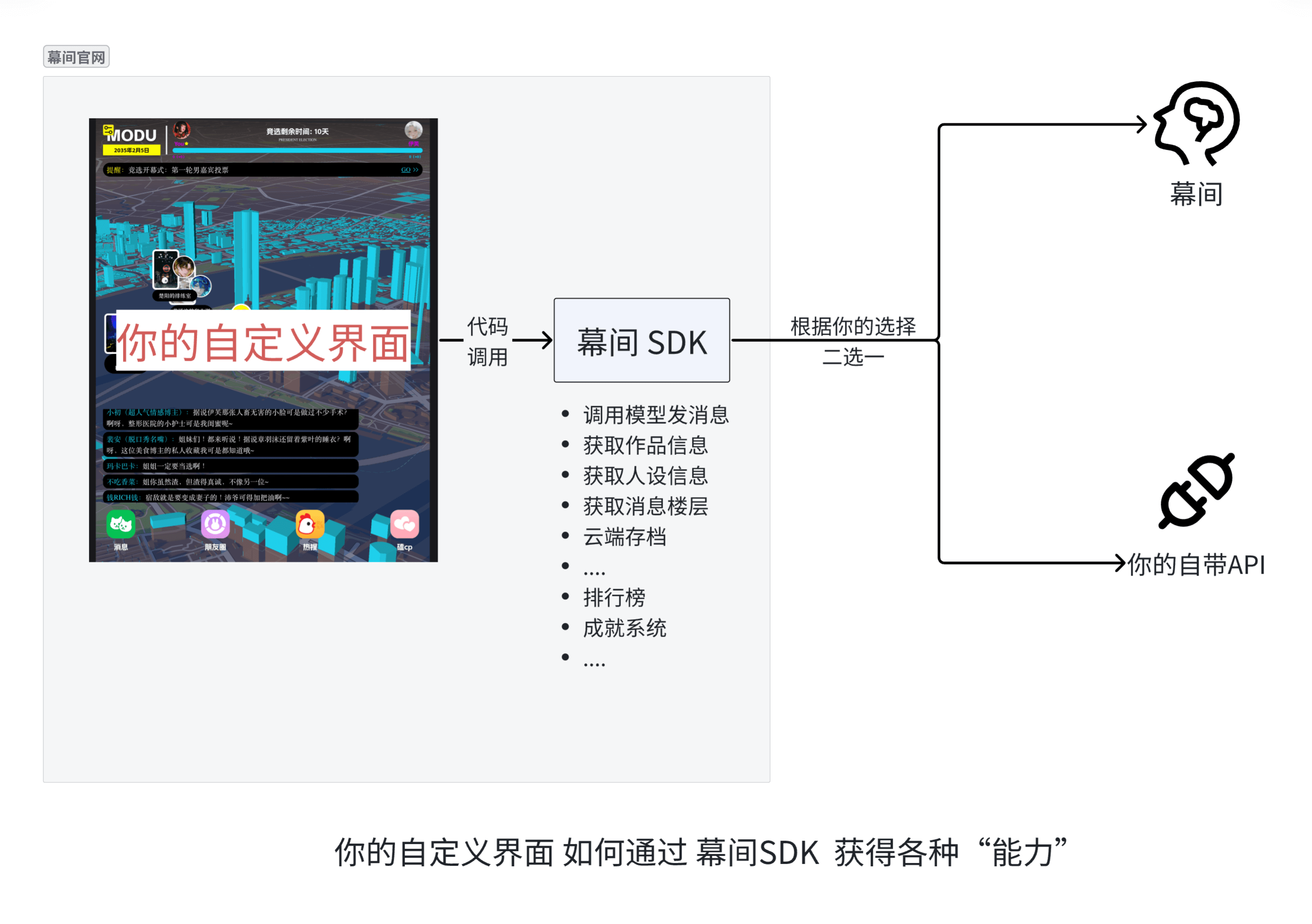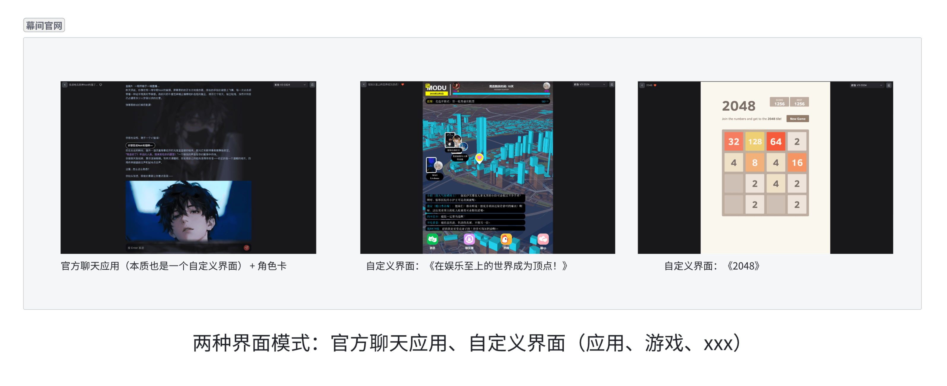 在 mujian.ai 中,我们设计了一种优雅、安全的界面开发和渲染方案,能够同时支持聊天消息界面渲染和独立界面渲染。其中独立界面渲染允许创作者直接上传本地开发好的 H5 页面/应用/游戏,并能够通过集成 MuJian-JS-SDK来调用我们提供的各种能力,进行完成作品的发布和分享。