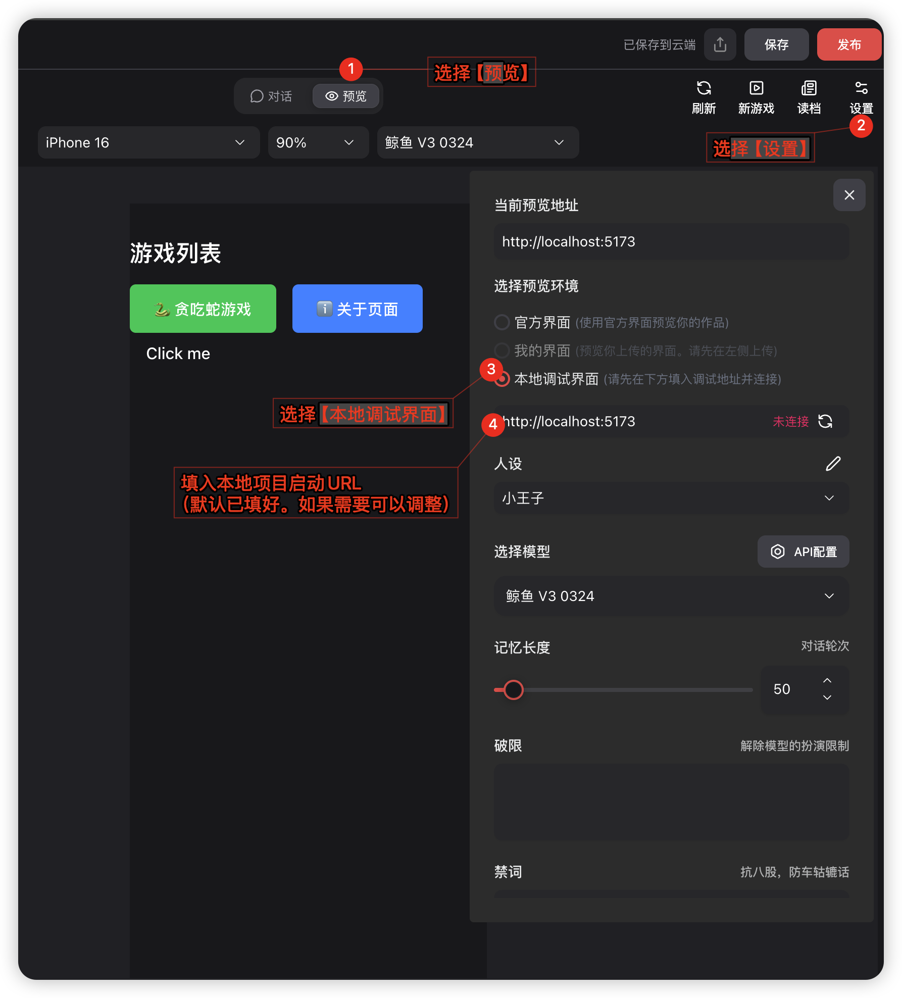 此时可以在创作界面,选择预览,然后选择 http://localhost:5173/ 来查看效果。