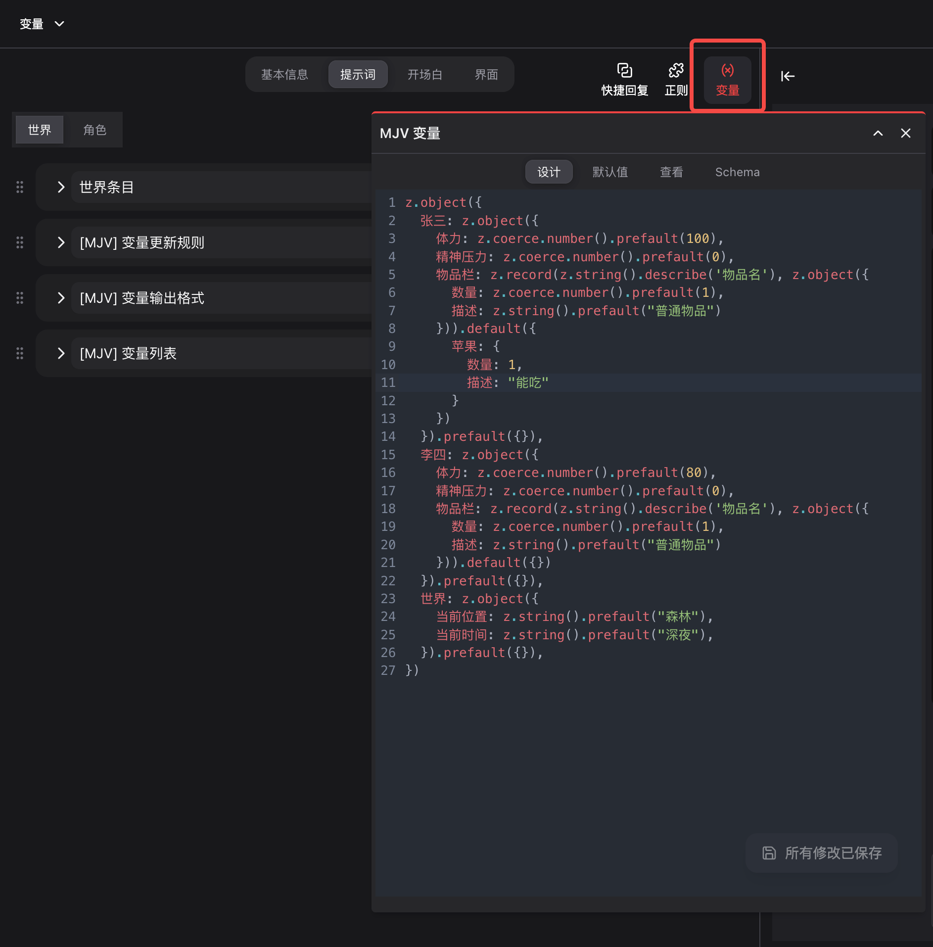 为了解决 AI 返回的状态栏数据不稳定的问题,我们提供了 MJV (Mujian Variables) 变量系统。