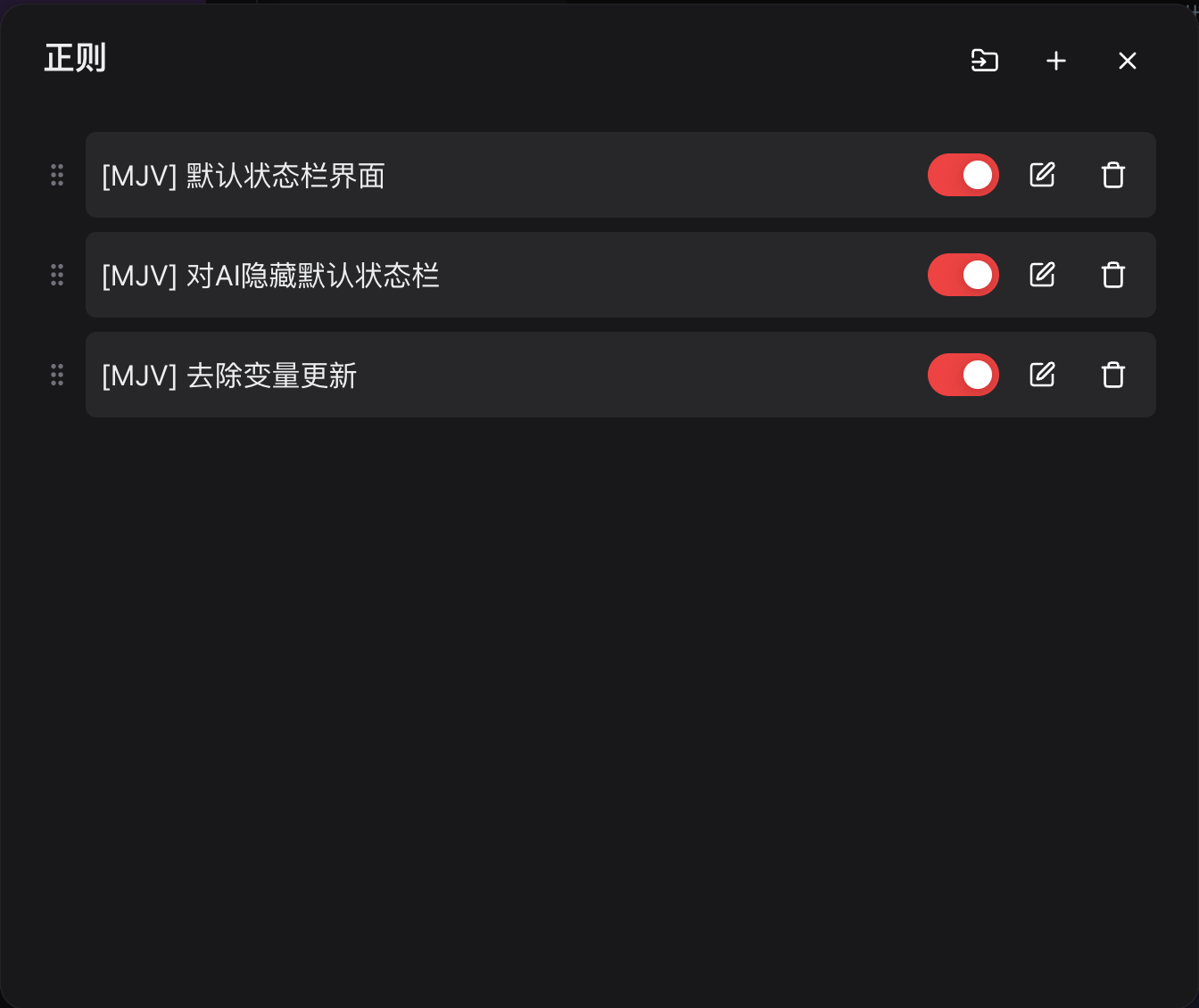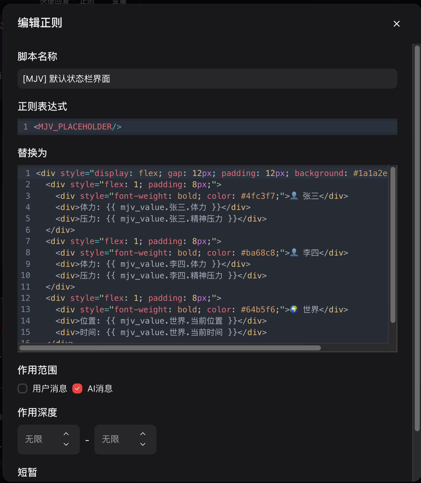 比如再 [MJV] 默认状态栏界面 这个正则中可以写以下代码: