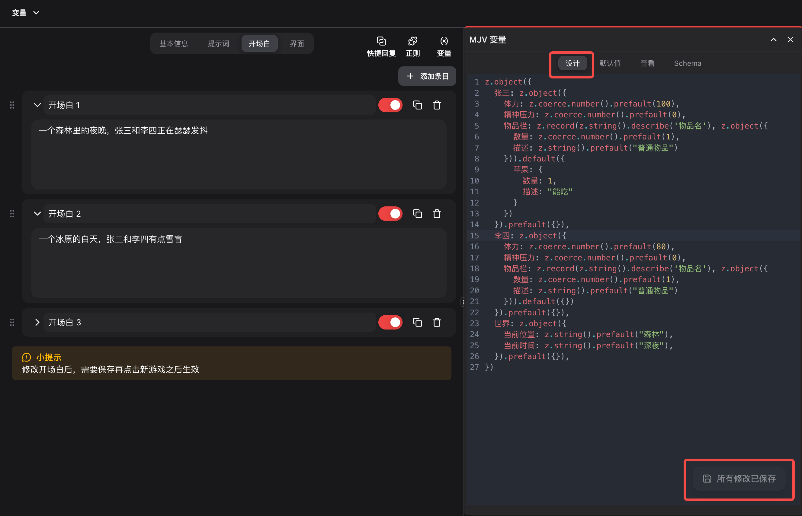 配置之后当玩家切换开场白时,对应的变量初始值也会变化。
