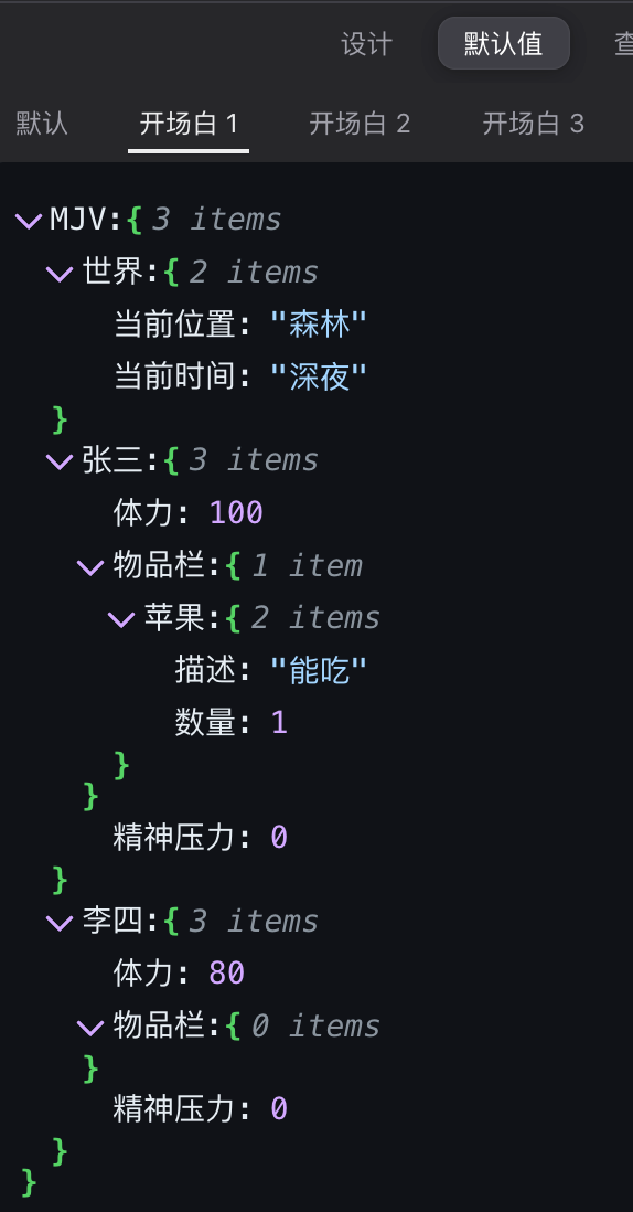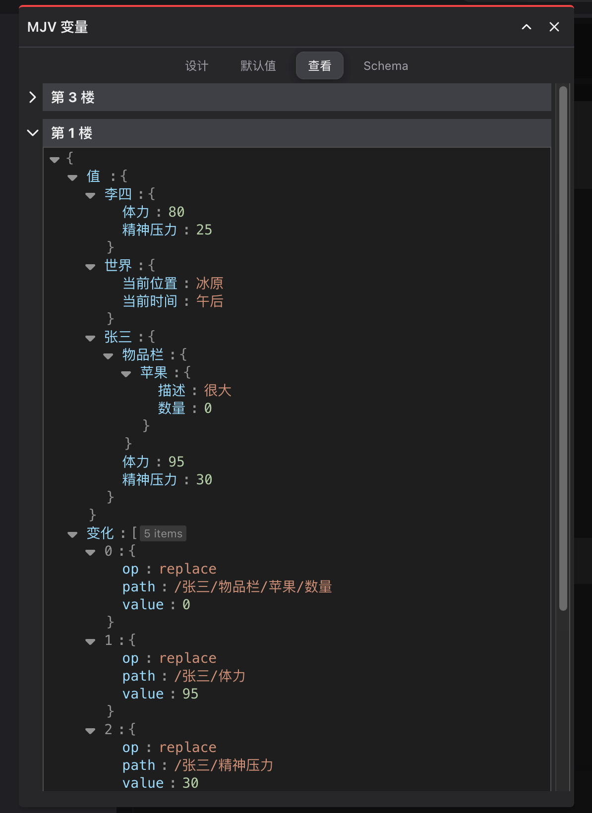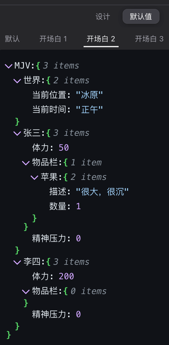 通过双花括号括起来的代码来读取变量,mjv_value 代表了根节点,比如 {{ mjv_value.张三.体力 }} 就是张三的体力值。